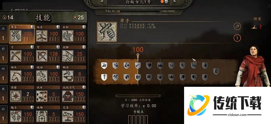 3.2、然后第二件事就是去找一个斥候。主角的加点和NPC的分工,我们主角自己没有这么多属性和专精点,再来点斥候了,所以我们需要找一个好的斥候NPC,来帮我们担任斥候。