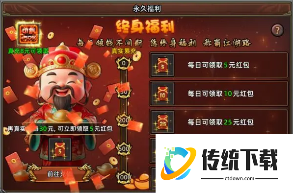 4、更有永久福利,打怪爆真充红包!每天领红包!本服有八种打金道具,由怪物掉落,玩家可通过回收打金道具获得指定数量的传奇币(稀缺材料,可提升龙魂,光翼),每日首充即可增加30次回收次数!勇士们利用好挂机功能,积累基础装备和材料。