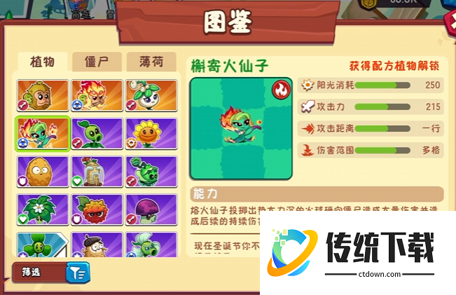 除了冰仙子之外,还有火仙子,自然是火元素的植物,伤害范围比较大,作为金卡,攻击力也达到了超高的215。它的大招是能朝着僵尸的方向投掷火球,初始造成大量损伤,后需还会让僵尸受到持续伤害。