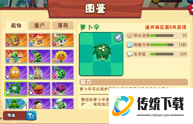 萝卜伞作为奇兵植物,在阳光的使用方面消耗低,虽然它并不具备攻击力,通常情况下并不会进行攻击,但是它的能力也是非常特殊的,毕竟新版本中有不少能通过空中行进的僵尸,这会给大家增加难度,带来较大的阻碍,而它就能阻挡空中的进攻,还能将空中下落的僵尸直接弹飞,拥有超强的对空能力。“容光焕发”就是它的大招,能让自己的血量和弹射此时直接回复到上限,生存能力非常强,同时对空效果还能持续恢复,有效对空中攻击进行阻碍。