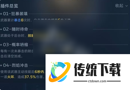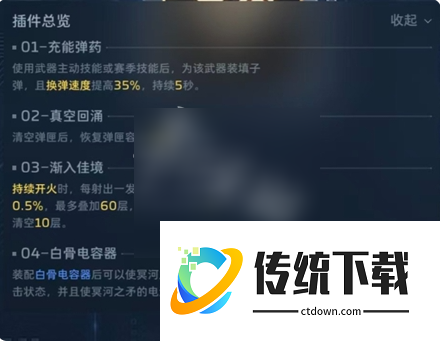3、这里2号插件和纯白是有区别的,冥河之矛得2号要带真空回涌,不要无限续子弹,要等到打空子弹,触发换单动作,并且能量已经涨了之后,直接用乘风技能打断换弹动作,继续输出,这样的话,基本上21秒就能充能完成,21秒一个大,另外就是4号要带专插。