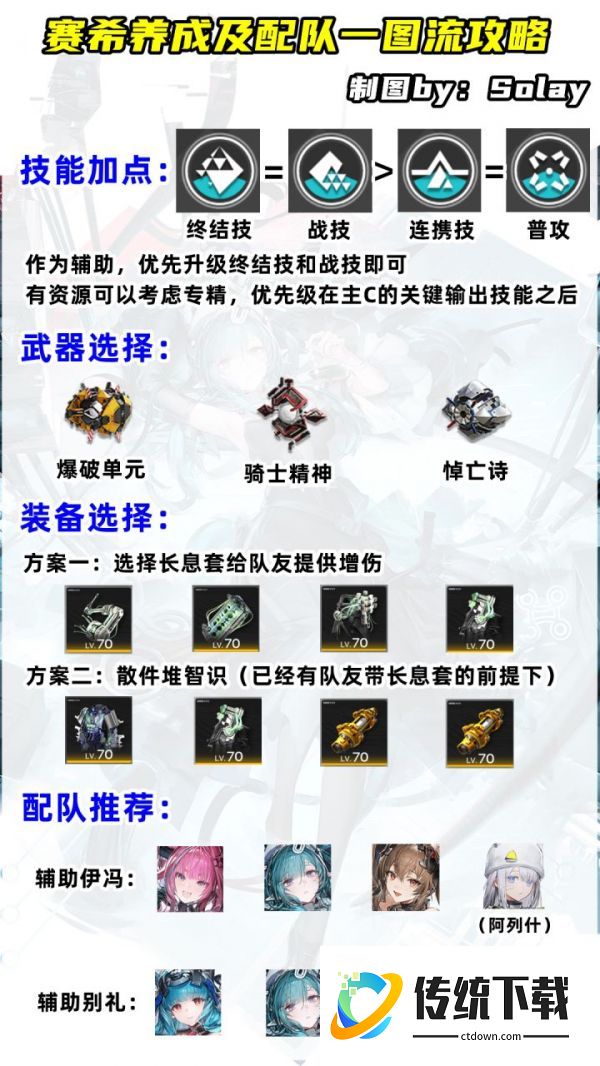 配队思路:赛希主要是作为冰队的辅助,同时在生存压力不大的情况下,因为战技有一定回血,也能兼顾生存位的作用,