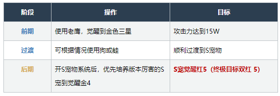 推荐觉醒到金色三星,当攻击力来到大致15W之后,老鹰的伤害提升就会变慢,这时候就可以把宠物换成狗或者蛙。