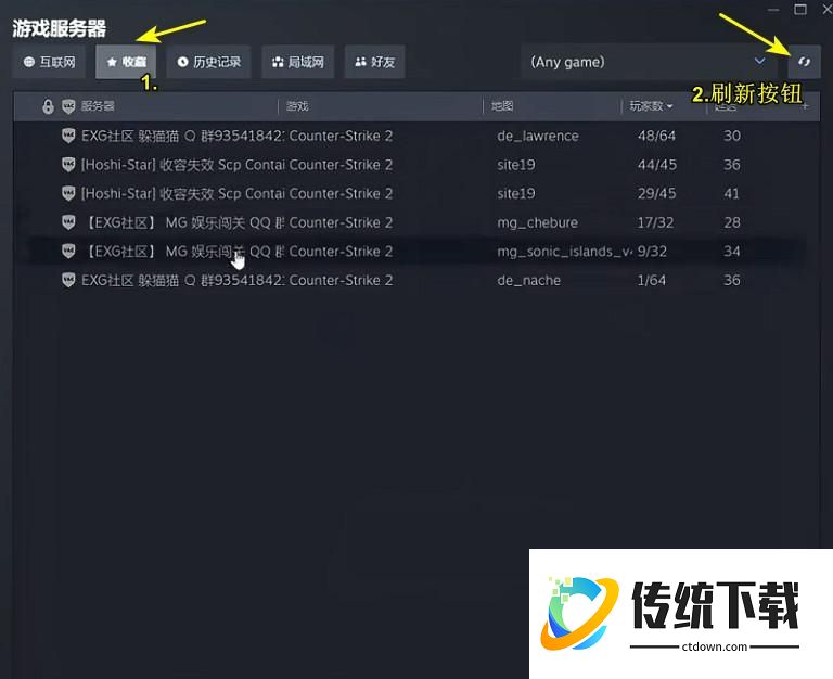 5.点击【收藏】,再点最右侧的【刷新服务器列表图标】(具体参考↓图2);