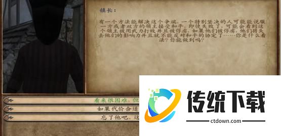 4,做任务。任务可以从城镇的镇长那里接,也可以从领主那里接。最值钱的就是阻止两个国家的战争的任务了,玩家可以用高说服说服两方的好战领主,也可以支付佣金打动对方,当然,你也可以简单直接,把反对和平的这两个领主击溃并抓起来,这样就没有反对和平的声音了。