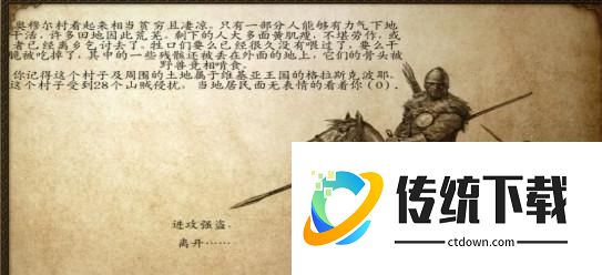 玩家可以在城镇中的女家属那里接到拯救被俘虏的领主的任务。玩家拿到佣金之后,可以和关押俘虏的城堡所有者谈判并支付佣金释放俘虏,也可以直接杀去监狱解救俘虏。当你选择后者的时候,最好去旁边的村落让村长放一把火,这样监狱的防御力量会大幅减少。