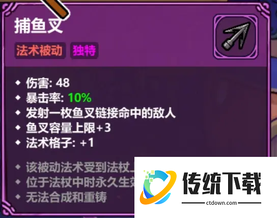 伤害不高,但是我们主要利用的是第二个词条,命中敌人30次后可以获得一发鱼叉,到此核心构筑的大体思路就出来了