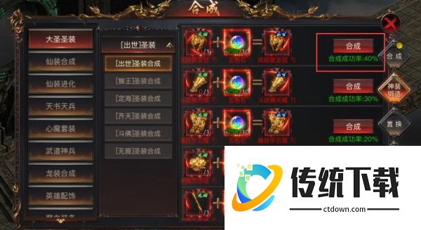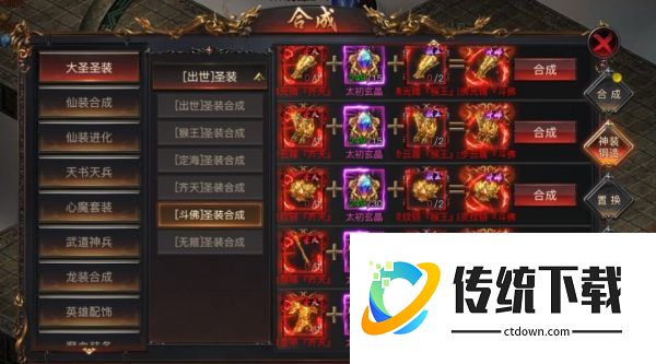 1)合成-神装锻造-大圣圣装,可以用低级的进行合成更高的大圣装备,合成的材料可熔炼多余的大圣装备进行获得,这里注意灵胎合成出世的有成功率,每次失败后会提升下次成功几率,后面等级的只有材料足够都是必定成功;