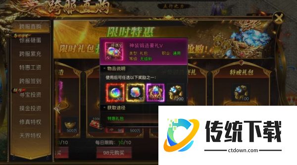 2)如果需要快速获取升级材料,可以通过购买跨服直购-圣装锻造礼包,每天最多可以购买5次,里面能获得大量合成圣装的材料;