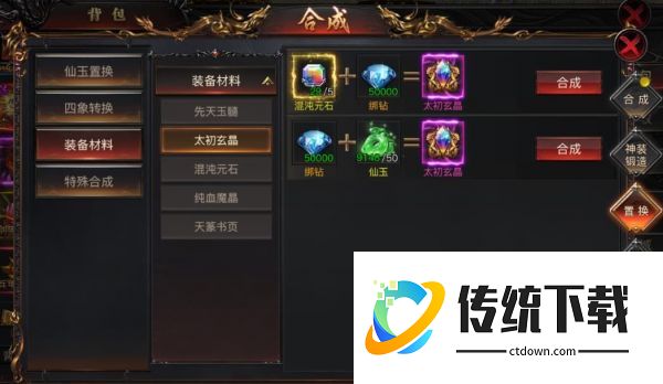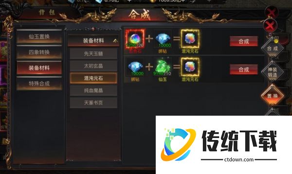 3)材料置换,在合成-置换里面,将多余的低级材料可以额外加钻石和仙玉进行置换成高级材料,充分利用起来做到收益最大化!