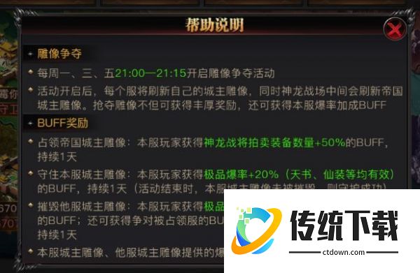 《烈焰觉醒》神龙战场雕像争夺战每周一、三、五21:00-21:15开放。战场设中央帝国雕像及四方雕像,占领中央可获得全服爆率+25%、拍卖收益+50%持续24小时;占领他服雕像可叠加爆率并提升PVP伤害;守住本服雕像同样获得爆率加成。同时达成三项胜利条件可触发全服爆率+80%的史诗增益。活动结束后参与成员均可获得稀有道具奖励,需全员协同攻守方能制胜。