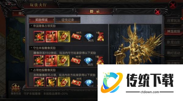若同时达成占领中央帝国雕像攻占其他三服雕像守住本服雕像,将会达成全服极品装备爆率直达80%, 史诗级增益持续 24小时!