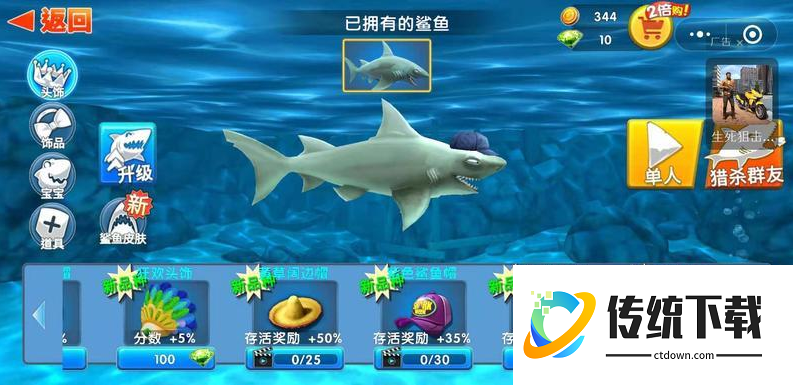 另外每次完成一次任务后可以点击看视频,这样金币收获也会翻倍。这个时候金币只要够了就升级鲨鱼,不要吝啬,鲨鱼灵活度高了在海里就会越灵活,这样获取的金币也就越多,这才叫投资。我就是用这个法一晚上鲨鱼就升级到下一个了。另外也可以看视频领装饰,戴上帽子的鲨鱼技能加分的,谁用谁知道~~