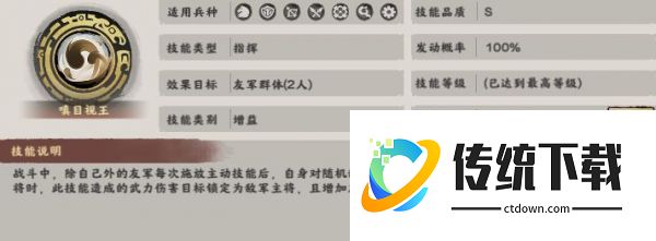 舞阳侯自带技能【瞋目视王】,在友军每次施放主动技能后,自身对随机敌军单体造成武力伤害(伤害率105%→210%),在主将效果下,攻击目标将锁定为敌军主将,同时提高友军5%→10%的主动技能发动概率。