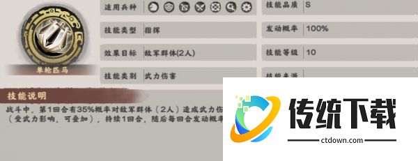 技能【单枪匹马】,是S2新增的事件技能,兑换消耗武将张飞、关羽和赵云。在战斗第1回合有35%的概率对敌军2人造成武力伤害(伤害率46%→92%),并使目标受到的武力伤害提高8%→16%,持续1回合,在随后的每回合提高15%的发动概率,该技能最多可发动5次。该技能在补充伤害的同时,提高了敌方受到的武力伤害,进一步提高了队伍输出。
