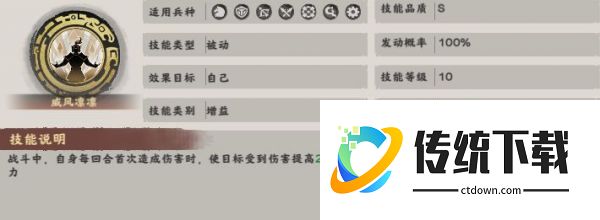 携带技能【威风凛凛】,是舞阳侯自身的传承技能,在战斗中,自身每回合首次造成伤害时,使目标受到伤害提高10%→20%,效果持续1回合,并按伤害率的30%→60%恢复自身兵力。得益于技能【瞋目视王】的技能效果,舞阳侯能够随着队友主动技能的触发,在一回合内对敌造成多次伤害,大幅提高【威风凛凛】的技能收益。