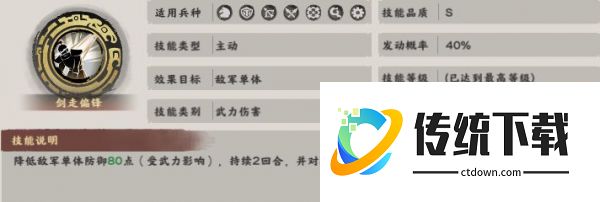 携带技能【剑走偏锋】,是项庄自身的传承技能,亦可通过项伯传承获得。该技能可降低敌方40→80点防御2回合,并对目标造成武力伤害(伤害率110%→220%)。