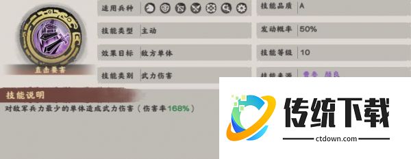 而【直击要害】,虽为A级紫色品质技能,但在这套阵容里能够打出相当不错的效果。技能触发后能够对敌方兵力最少的单体造成武力伤害,在敌军主将进行了一波针对性攻击后,敌方主将大概率将成为队伍中兵力最少单体,经由【直击要害】锁定,有几率直接完成收割,迅速结束战斗。