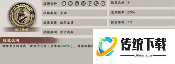 项庄自带技能【鸿门舞剑】,对敌军主将造成一次伤害率为148%→296%的高额武力伤害,同时施加2回合禁疗效果。配合主将舞阳侯的技能效果,形成对敌方主将的针对攻势,加速瓦解敌方队伍。