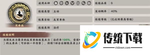 技能【哭秦庭】,是申包胥自身的传承技能,可为损失兵力最多单体进行治疗(治疗率98%→196%),同时使目标获得当前兵力10%→20%的义勇兵为其分担一半伤害,义勇兵持续1回合后解散。该技能通过有针对性地进行治疗,能够让队伍的整体生存能力得到大幅提高。