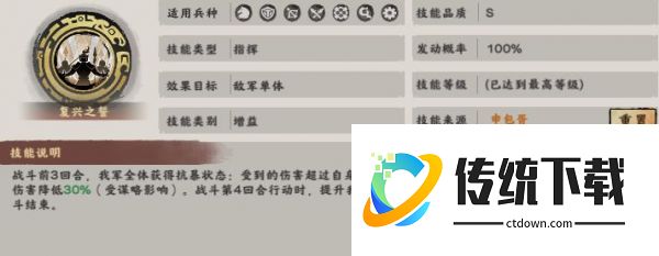 申包胥的自带技能【复兴之誓】,可在战斗的前3回合,为我军全体提供抗暴状态。我方在受到伤害超过自身可携带最大兵力的8%时,能够使该次伤害降低15%→30%。从战斗第4回合申包胥行动起,使我军全体造成伤害提升10%→20%。为我方队伍的生存提供保障的同时提供了增伤加成。