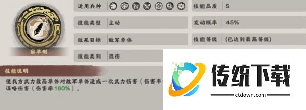 技能【察举制】,触发后可使我方武力和谋略最高的单体分别对敌军单体造成一次武力或谋略伤害(伤害率80%→160%),为队伍进一步补充了伤害量。