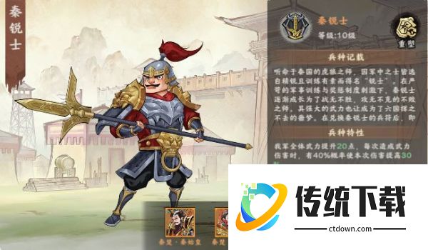 兵符秦锐士,兑换消耗武将秦始皇和李斯。在战斗中能够提升我军武力属性10→20点,并在我军每次造成武力伤害时,有40%的概率使本次伤害提高15%→30%。队伍的核心输出角色舞阳侯和项庄,主打武力伤害,且在【瞋目视王】技能效果下,舞阳侯有很大几率能够进行多次伤害,通过秦锐士的伤害提升效果,有概率获得伤害提升加成,进一步提升伤害。