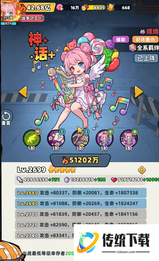 绵绵的强度是不可忽视的,即将登基的新王。她最核心的竞争力就是她的招牌技能绵绵金炮。不同于传统的辅助,绵绵不但是后排的沉默者,而且是治疗加输出的全能战士,带着奶系英雄来到了新的高度。该角色既可以对敌人造成毁灭性的打击,又可以在输出的同时给团队源源不断地输送生命支持。她具有能奶能C的双重机制,在推图、打BOSS和竞技场中都有很高的统治力,属于典型的人权卡。