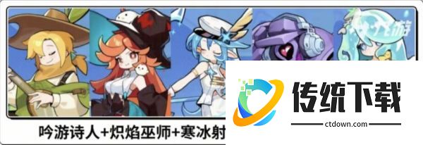 国家队阵容:吟游诗人 + 炽焰巫师 + 寒冰射手 + 摇滚巨石 + 果冻少女