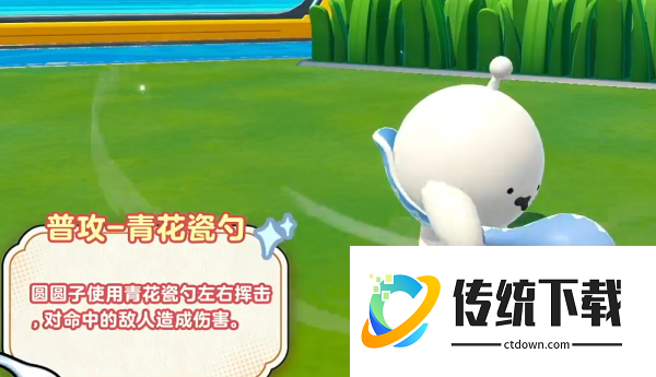 普攻是青花瓷勺,左右挥击对附近敌人造成伤害。没什么特别复杂的操作,就是基础的近身攻击,适合在技能冷却的时候补刀用。一技能叫糯糯敲击。圆圆子会鼓起肚子,然后用勺子敲自己的肚子,把糯米浆震散出去,对附近的敌人造成伤害和减速。这个技能主要用来控制对方的移动,对手被减速之后走不快,后续连招就更容易打到了。近身战的时候先放这个,对方跑不掉,后续输出更稳。