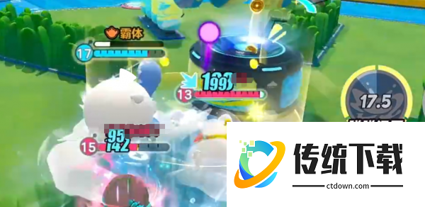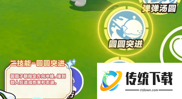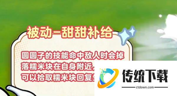 先说圆圆子的被动,叫甜甜补给。这个机制比较特别,技能打到敌人之后,会在自身附近掉落糯米块,然后圆圆子可以捡起来回血。也就是说,只要技能持续打到人,就能一边打一边补血,续航能力很强。更有意思的是,圆圆子的血量越高,体型就越大,技能的覆盖范围也会跟着变大。所以保持高血量不只是为了活得久,还能让技能打出更大的效果,两件事是连在一起的。