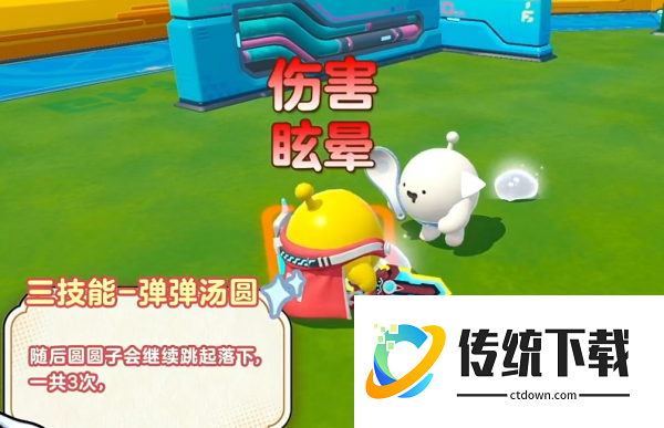 三技能叫弹弹汤圆,这个技能是圆圆子最核心的输出和控制手段。圆圆子会跳起来落到目标位置,第一次落地会对范围内的敌人造成眩晕和伤害。眩晕期间对方完全动不了,是很好的连招窗口。落地之后圆圆子不会停,会继续跳起来再落下,一共三次。第二次和第三次落地不再眩晕,但会造成伤害和减速。而且这三次跳跃期间可以改变方向,不是直线固定路径,可以根据场上情况调整落点,灵活性比较高。