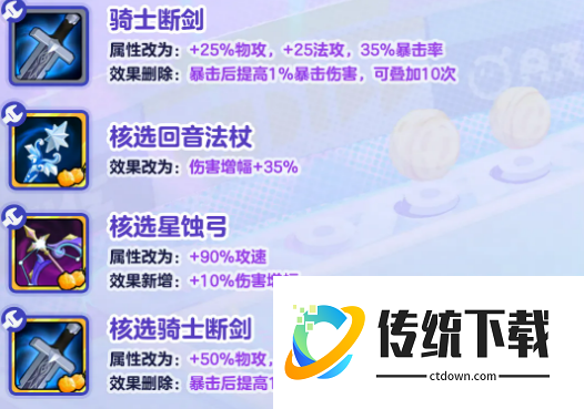 骑士断剑的改动幅度比较大,属性变成25%物攻、25%法攻、35%暴击率,但是原来那个暴击后叠加暴击伤害的效果被删掉了。核选版本属性翻倍,物攻法攻各50%,暴击率75%,叠加效果同样删除。删掉叠加效果之后,这件装备的上限可能会低一些,但基础属性还是挺扎实的。
