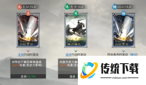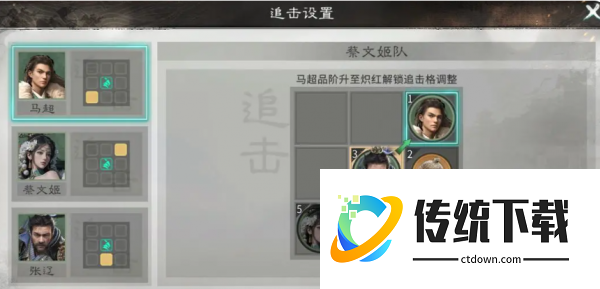 然后张辽的话,在这里可以带白虹贯日之类的技能,对面的敌人造成输出的时候,是根据所在行列的敌人,对他造成输出之后还可以根据张辽自身天赋带来足够的点杀能力,后期追击的话,大家可以带横刀耀武,这个技能对敌方目前武力数值最低的一个目标来说,造成的伤害是能够达到最高数值的,蔡文姬在这个阵容里面就是辅助定位的角色,她能够带来的一个主力技能就用鼎力相助技能,这样的话就可以让踩中追击格子的武将带来足够的伤害加成。