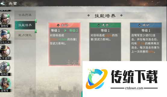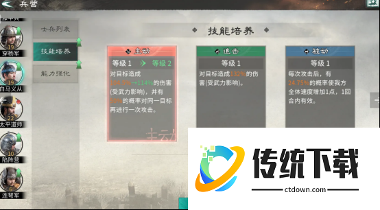 主要的核心特色就是优先提升兵营等级,集中相应的资源培养众多具有特技的士兵。首先要注重的就是兵营建设以及征兵,具体的士兵等级和兵营绑定是非常关键的,士兵等级并没有办法单独提升,完全取决于兵营的等级,当兵营升级之后,士兵便会自动获得对应的等级基础属性。日常征兵非常关键,每天务必都要及时进入募兵所完成征兵,并及时返回兵营,完成升级,士兵的基础属性越强,后续培养收益也就越高。