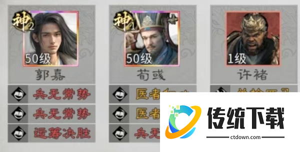 这一套阵容的核心就在于形成完美的战术链,荀彧的王佐之才就可以有效起到辅助的效果,在战斗刚刚开始时就能提升许褚10点武力,还有5%的攻击。四维属性的加成就可以带来更好的输出面板,让后续的伤害也会拥有扎实的基础。郭嘉的10胜10败就成为了爆发的关键,在触发之后就可以叠加获胜的机会。不仅可以提升技能发动的概率,还可以额外的触发两次背水一绝,能迅速的实现速攻爆发。这一个技能就能精准的锁定敌方战斗力最高的单位。