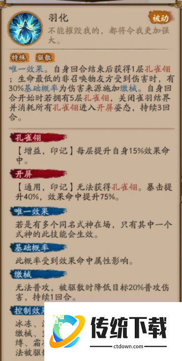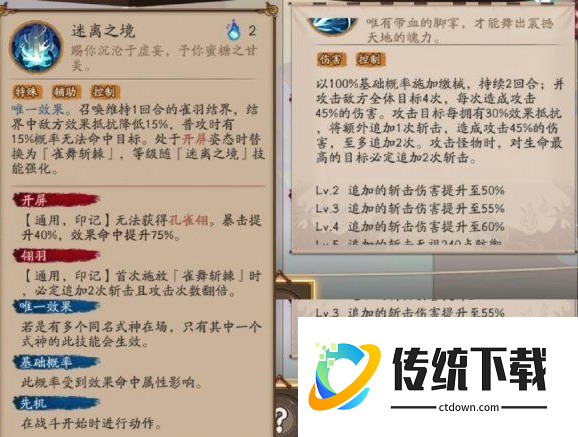 召唤结界,降低对方抗性,开屏会替换成强化大招,对敌方群伤4次之后还会进行追加攻击。