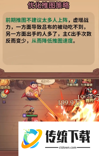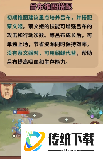 前期推图的时候不用上太多人,优先搭配一个蔡文姬和吕布即可,前者能够增加吕布的攻击与行动次数,两者结合之下,吕布的伤害和出手次数都会更多,相对而言,整体的推图效率也就得到了提升。