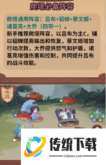 推荐按照“吕布+貂蝉+蔡文姬+大乔+诸葛亮”这套阵容进行布置,吕布算是前期赠送的一个强力角色,可以把资源都投入到他的身上增强输出,完后其他四人都可以当他的辅助,以此提供增伤,回复,护盾和行动次数等多重增益。