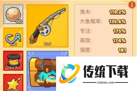 1、渔具:鱼竿、鱼漂、鱼线、鱼钩,每个部分都有单独的功能特点同时也要单独进行升级。