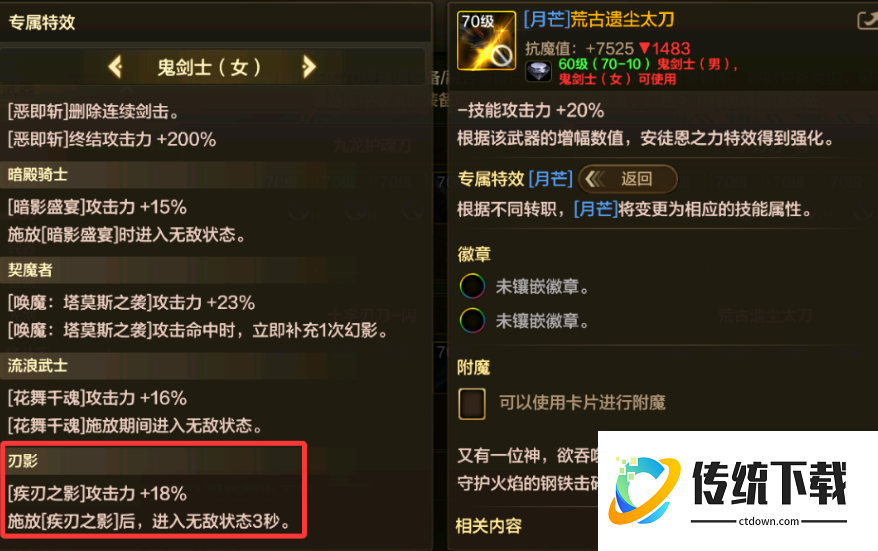 月芒太刀是刃影的毕业武器,其特化词条为“45级技能攻击力+18%”,并附带3秒无敌效果。释放45级技能后,刃影可进入无敌状态,大幅提升生存能力,尤其在高难度副本中表现卓越。