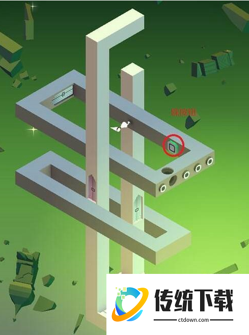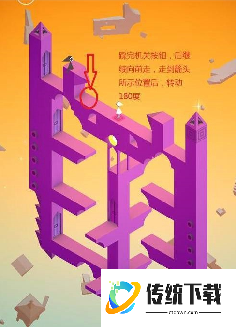 7、移动底部方块,进入另一扇小门,沿路走到靠近乌鸦的转块,旋转建筑,踩住黑色按钮,点亮机关。