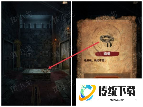 1、拾取石床上的【麻绳】