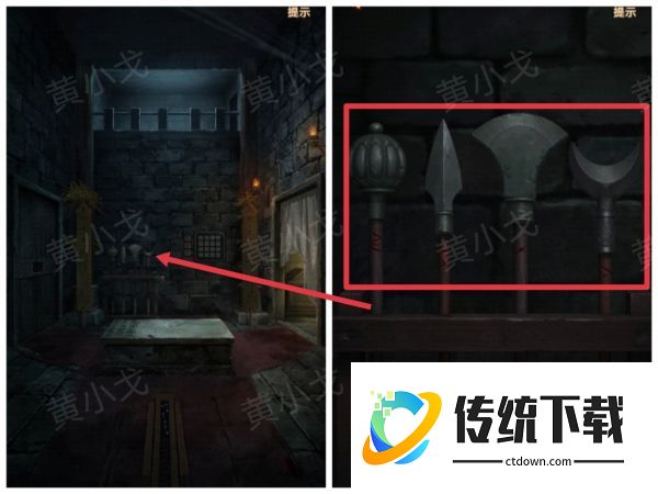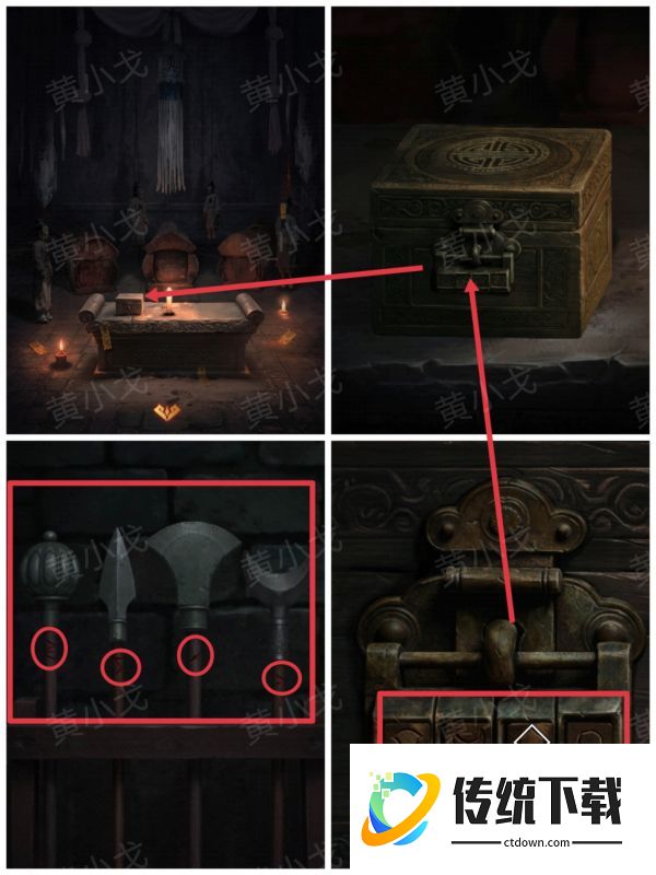 4、点击石桌上的盒子,根据[主殿]武器架上武器的形状和红线数量,调整密码锁