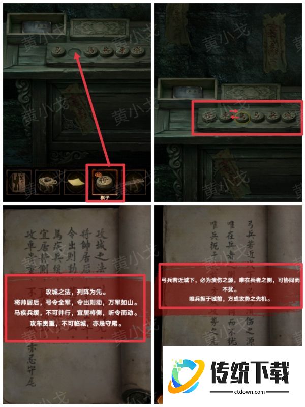 9、把【棋子】放到木盘上,根据《攻城》上的线索,正确摆放棋子的位置,旁边的画布掉落