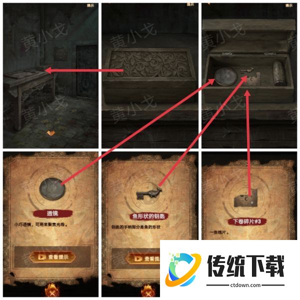 12、点击打开桌子上的盒子,触发剧情,获得【透镜】、【鱼形状的钥匙】和【下卷碎片3】