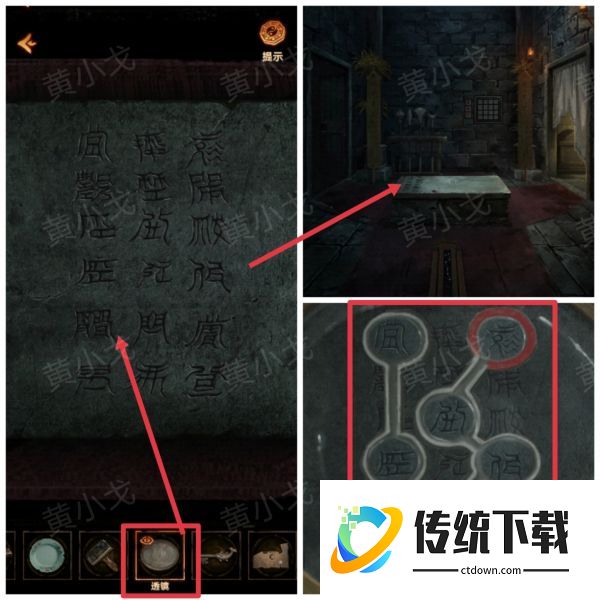 13、点击石床上的字,使用【透镜】,获得线索