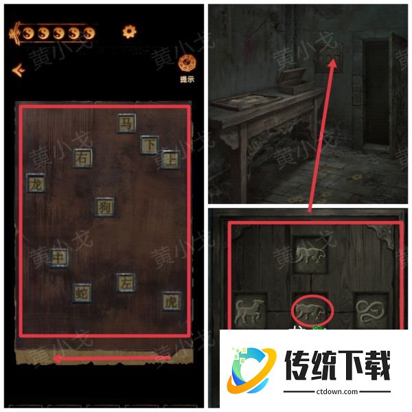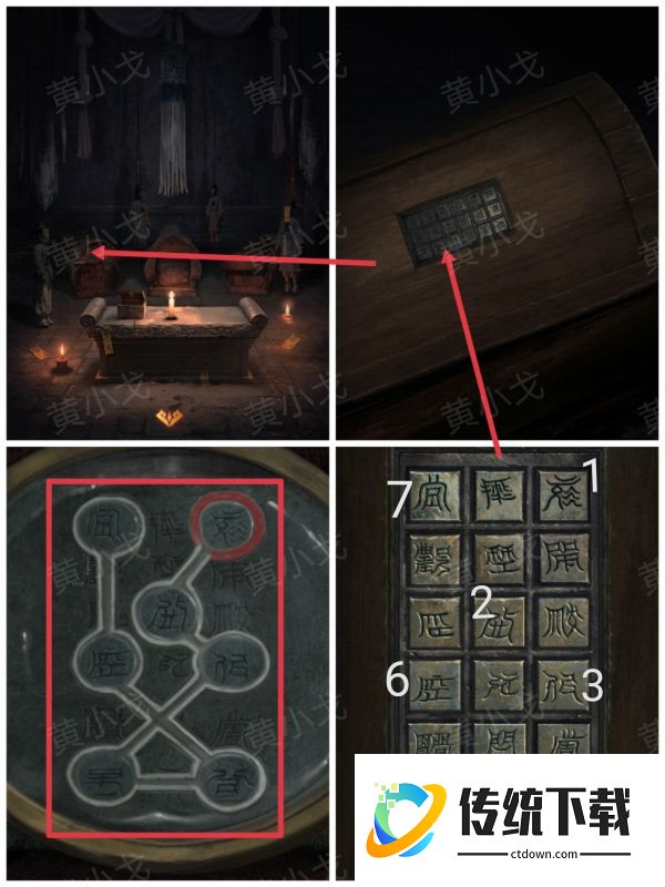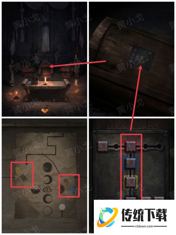 14、点击左侧棺材上的机关,根据[主殿]石床上的线索,按顺序按下字按钮,打开棺材