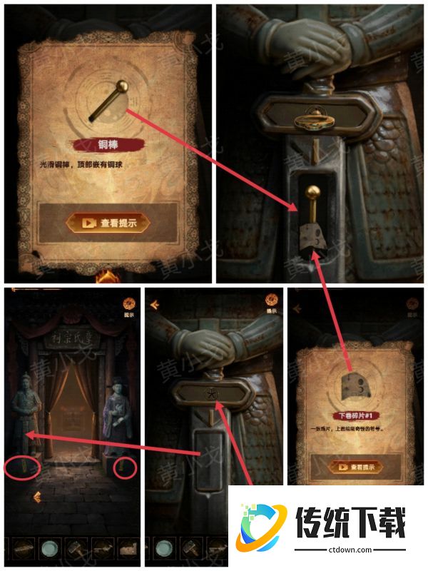 16、点击武将瓷偶的剑,用【多齿钥匙】打开暗格,获得【下卷碎片1】和【铜棒】