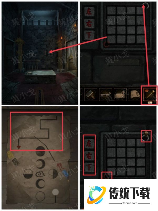 23、点击墙上的机关,装上【铜棒】;根据拼好的下卷纸张上的路线,按顺序按下按钮